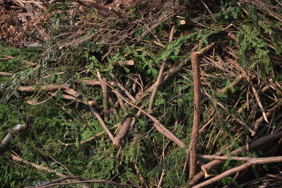 Baumschnitt und Heckenschnitt bestehend aus Sträuchern, Ästen und Stämmen.