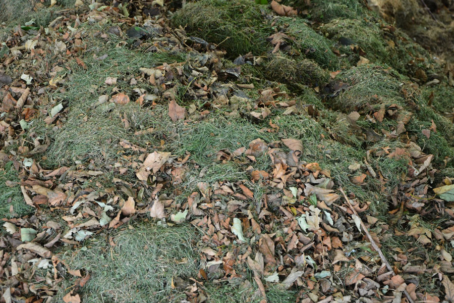 Gemisch aus Laub, Grasschnitt, Unkraut, Fallobst, Sträuchern zur Kompostierung.